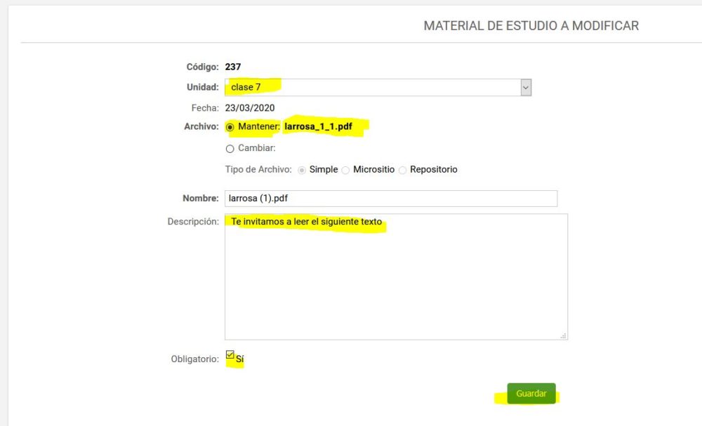 Como agregar material de estudio a una clase Previamente crear la clase Luego ir a Seleccionar la clase donce quiero incorpar el material de estudio Por ej : clase 7 Luego tidar mantener subir el archivo tildar si es obligatoria la lectura y guardar los cambios